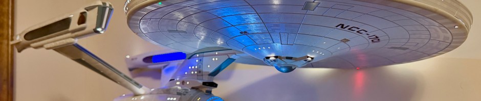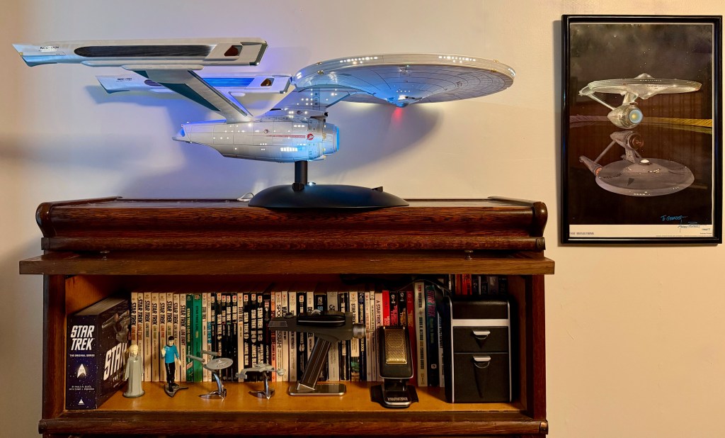 My latest and final such acquisition is a diecast metal model of the U.S.S. Enterprise refit from 1979’s Star Trek: The Motion Picture. It weighs about 20 pounds and is nearly a yard long thanks to its 1:350 scale. I placed it on my barrister’s bookcase that is filled with various Trek tomes and toys.