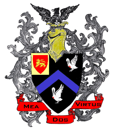 The Meadows coat of arms originated at Wytnesham, Norfolk County, England in 1188. It consists of a sable (black) shield with an azure (blue) chevron. The shield is divided into three sections. On two of these is a pelican plucking its breast with its beak, leaving a gules (red) spot of blood. This is a symbol of self-sacrifice, arising from a myth that pelicans wounded themselves to feed their young in times of famine. On the third section of the shield is a statant (standing) lion, a peaceful but wary stance symbolizing the guarding of home and country. The motto below the shield, Mea dos virtus, translates as, “My gift is virtue.”